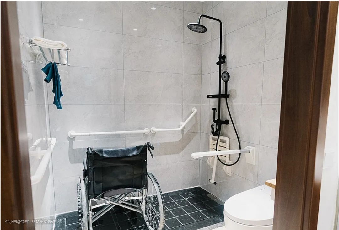 - 无障碍设计:这一点非常关键,比如卫生间可以不用门槛石或使用非常低的门槛石,防止老人进出摔倒、磕绊。卫生间不宜做坡度很大的找坡,还要用防滑地砖,防止老人洗澡时滑倒。淋浴房尽量不要用挡水条,防止老人洗澡磕绊摔倒。