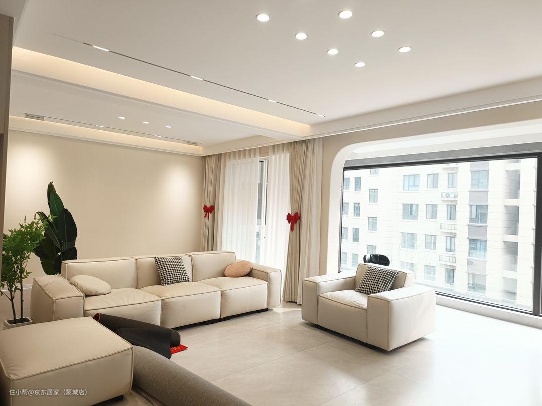 客厅给人第一感觉就是纯净,设计简约而有质感。整体空间都为暖色系,浅色系的家饰营造出时尚,温柔的气质。天花上无主灯的设计呈现出简约大气的视觉效果。