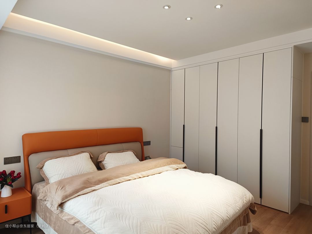 通体奶杏色乳胶漆墙面,在隐藏灯带的灯光下更加温暖。摆上橙色的皮艺床+白色床单,让整个卧室空间显得格外的温馨舒适。