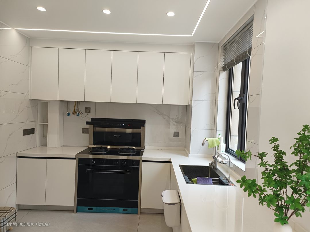 开放式厨房,L型厨房设计,吊柜+人造石台面+地柜,分段式的纯白搭配,明亮通透,空间的收纳翻倍,让台面更加干净整洁。