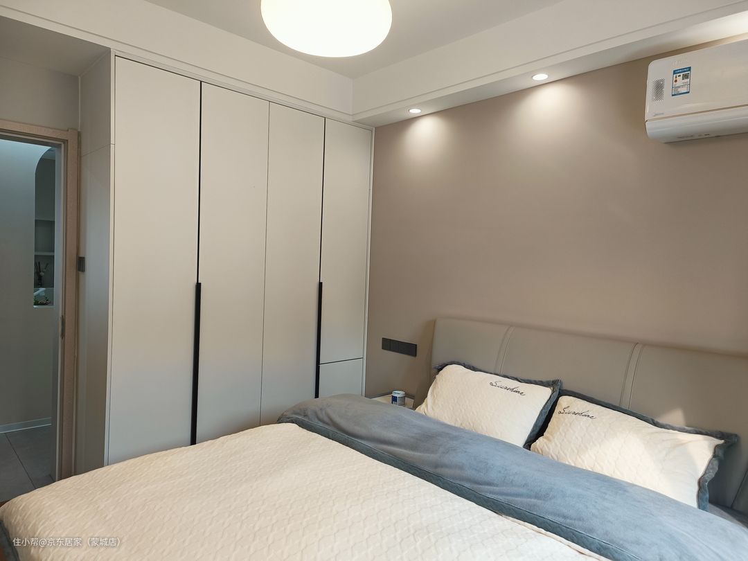 次卧延续主卧的简约风格,床头背景墙杏子灰搭配同色系皮艺床,浅灰色的通顶衣柜承包了整个卧室的收纳。