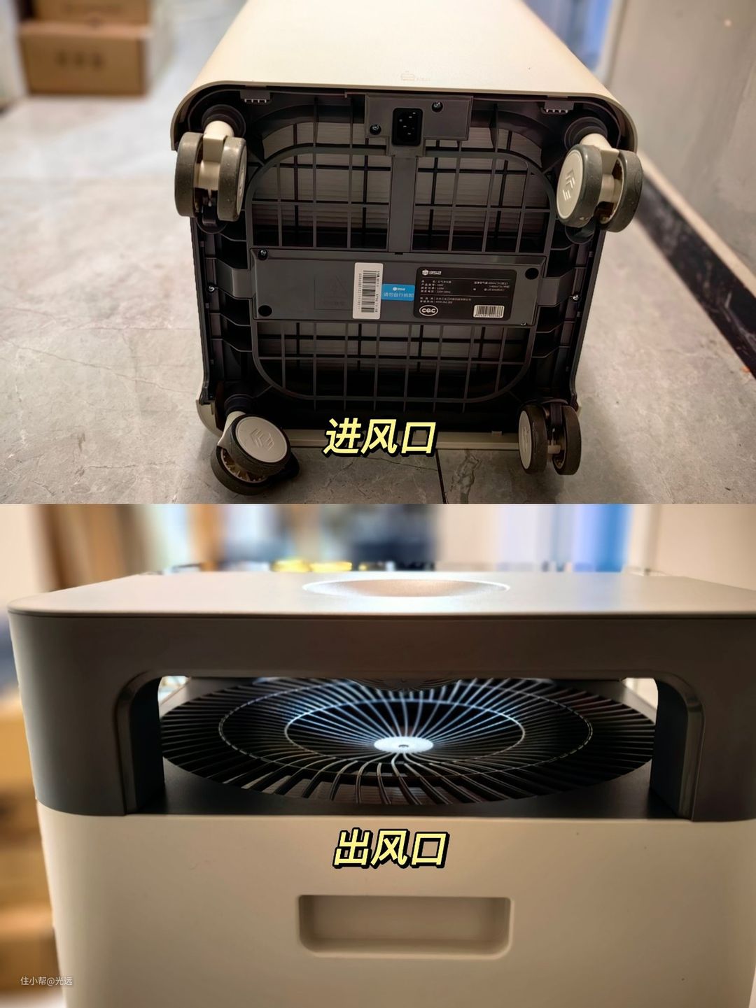 最下层是滑轮组,滑轮都是万向轮,日常挪动方便,其次是进风口,进风口是个规整的平面,同时进风口设计得很大,保证了进风量。机身中间部分是滤网组,采用塔式结构,稍后会拆开。机身次顶部是出风口,出风口上有网罩保护,设计得相当简约、合理。