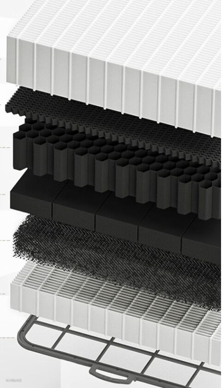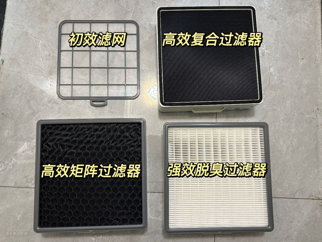 四层过滤网的功能有所不同,初效滤网的孔径较粗,初效滤网主要进行初步过滤保护后续滤网,长时间使用无需更换,使用一段时间后水洗晾干即可;高效复合过滤器采用的是铝网粘炭工艺及70%过滤效率的高效滤纸,进一步过滤较大颗粒物,吸附大部分异味和部分甲醛;高效矩阵过滤器平时的主要作用是充分吸附TVOC和甲醛等,降低净化时空气阻力,进行高效净化;强效脱臭过滤器采用的是特殊工艺处理的除臭催化模块及H13等级的高效滤纸的组合,这两个组合能对室内异味吸附降解,H13级别净化效果也足够充分。