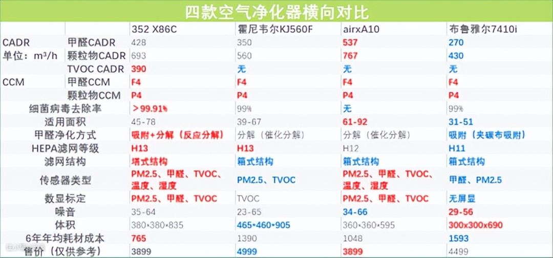 当然这里我也对几款空气净化器,进行了对比,发现了一些问题,几乎可以说,几款空气净化器之间的区别还是比较明显的,以下是几款热门空气净化器:352 X86C、霍尼韦尔KJ560F、airxA10、布鲁雅尔7410i之间的数据差别。