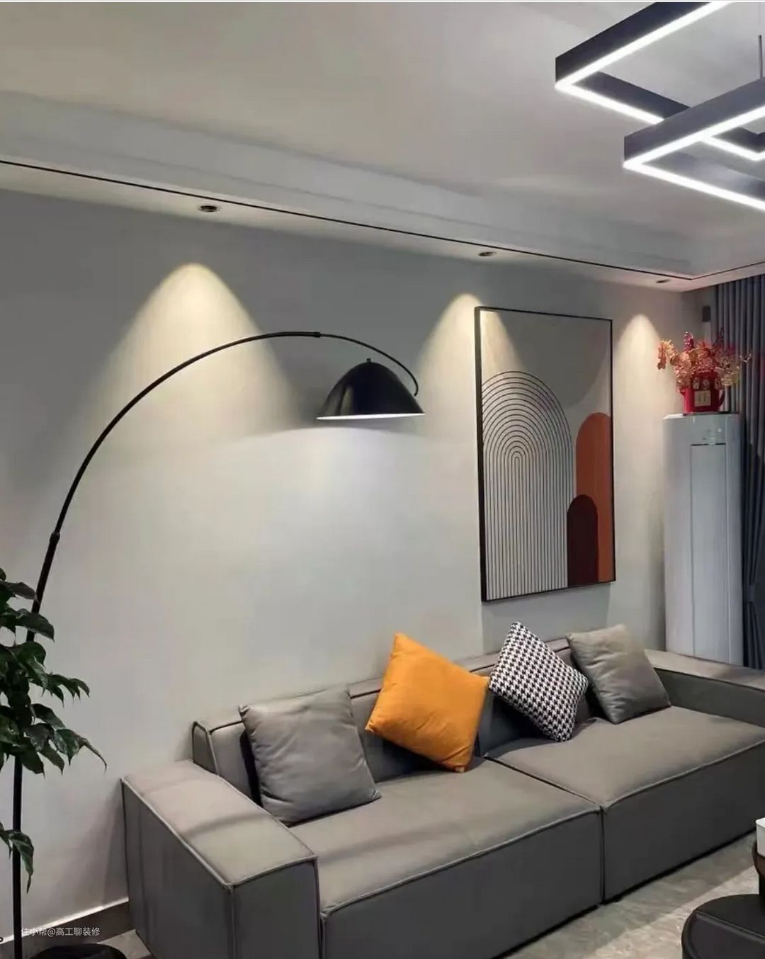 筒灯:主要是平面光源,泛光类灯具做基础照明,整体空间会明亮,常安装在客厅、过道、阳台等不同功能区域,筒灯的光源一般不可调节角度,发光均匀较散面积大,特别是层高很高的光线就没办法打到地面上,打到墙面上也没有小山丘效果。