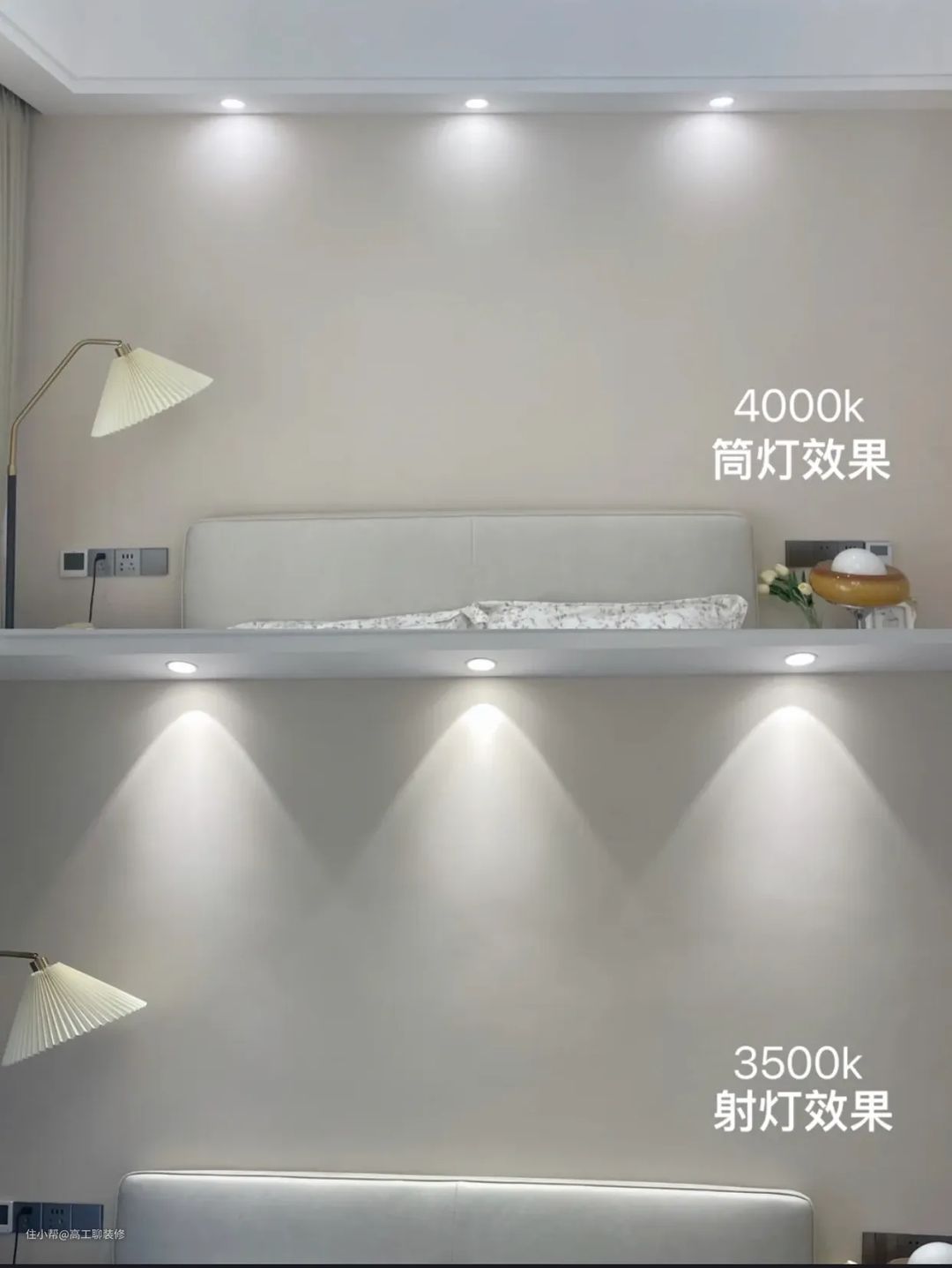 运用场景主要是以家装为主,像卧室是休息的地方,色温尽量低点,这样有利于睡眠,射灯色温参考值:3000K—3500K,筒灯选择三个可替换的。