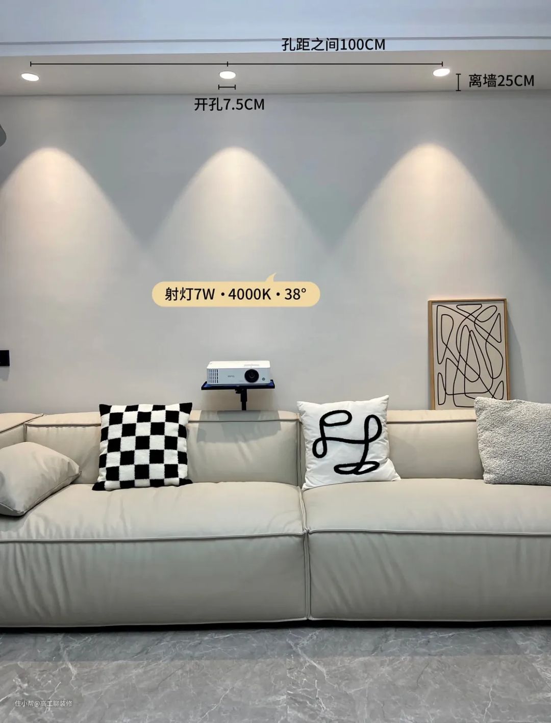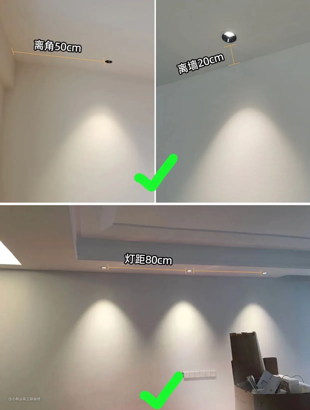 灯距把握不好,容易出现光斑,一般推荐距离80—120cm都是可以的,墙角离边处不要超过60cm就合理,灯与灯之间的距离建议1m或者1.5m就合理。
