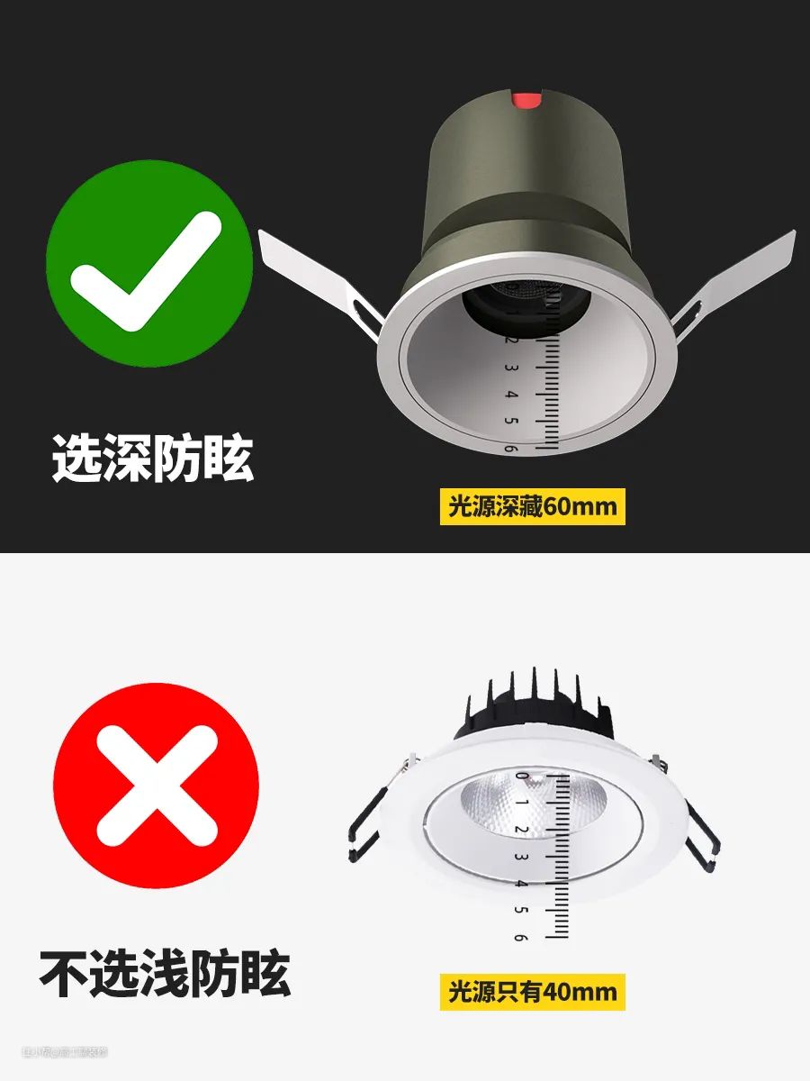 深杯防眩的灯,有见光不见灯的无主灯设计效果,从尺寸上看,深杯防眩建议距光源50—60mm合格。