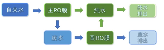 再对双RO膜的工作流程进行设计:让主RO膜排出的废水,由副RO膜再净化一遍。