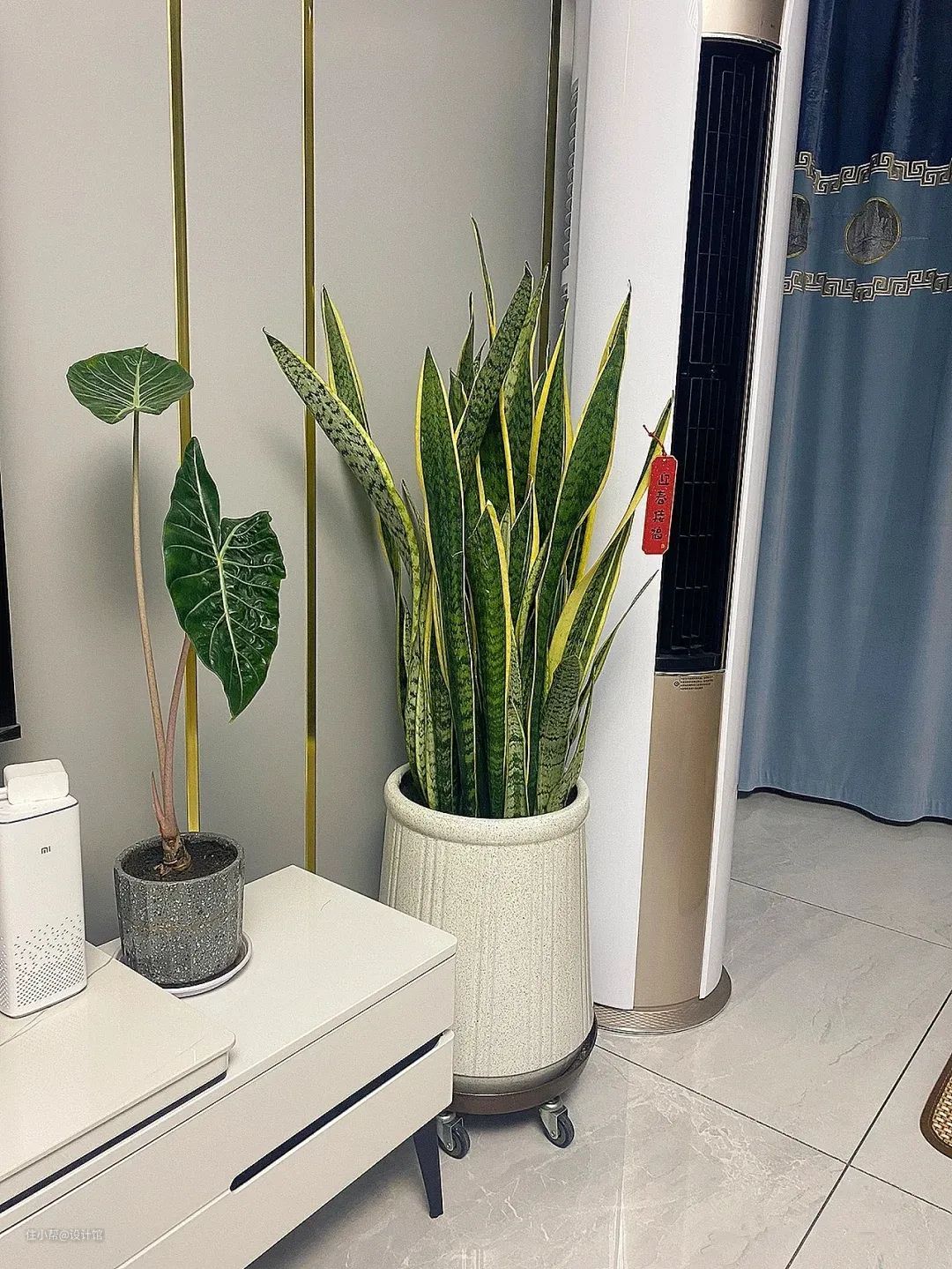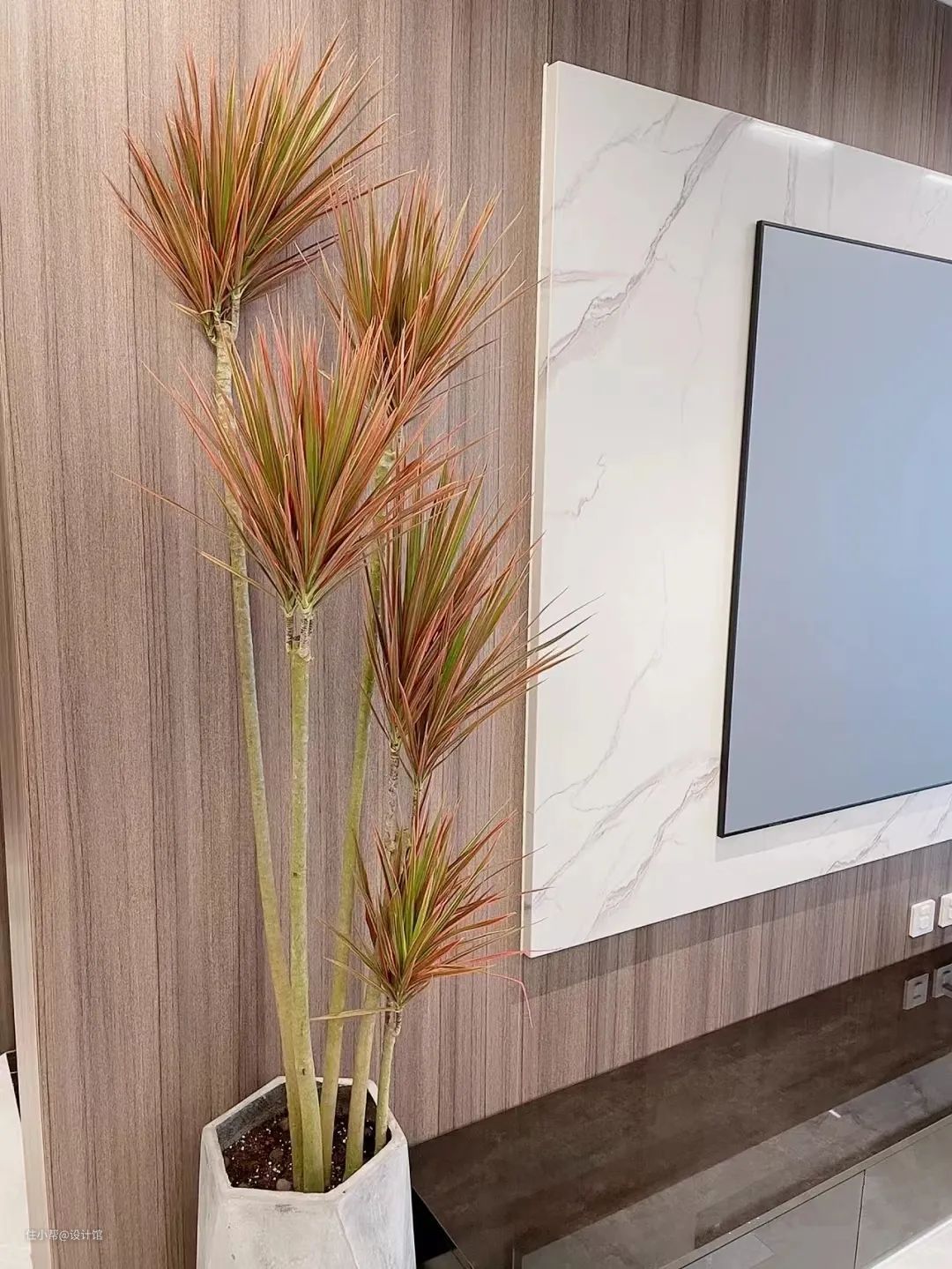 千年木比较高大,适合放在背景墙的旁边,比如沙发或成品电视柜的边上,摆一盆千年木上去,可以提升整个背景墙的格调气质。