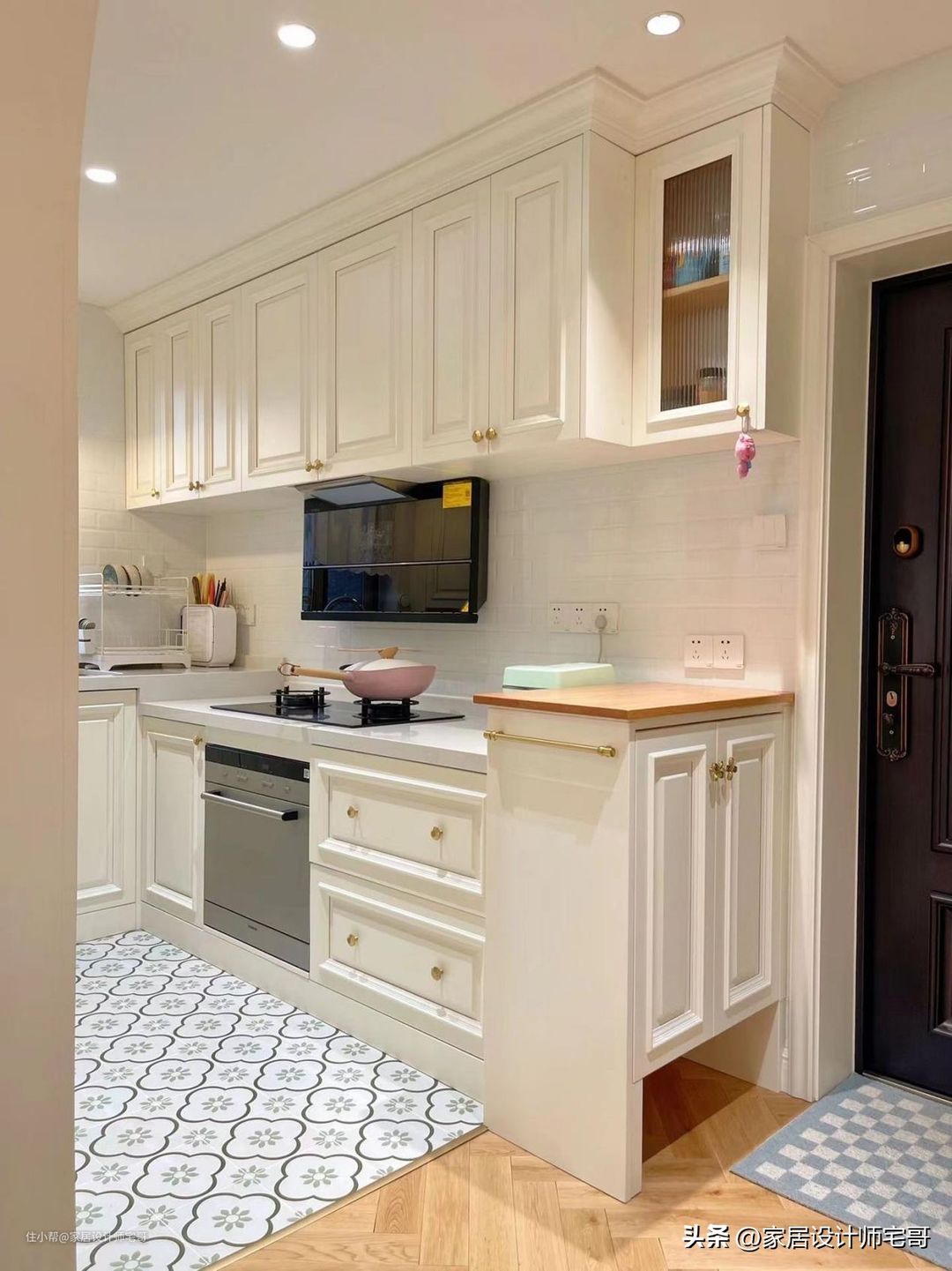 通体白色的橱柜,搭配上黑色的厨具和电器,以及碎花的地板砖,整体给人一种清新又大气的感觉。