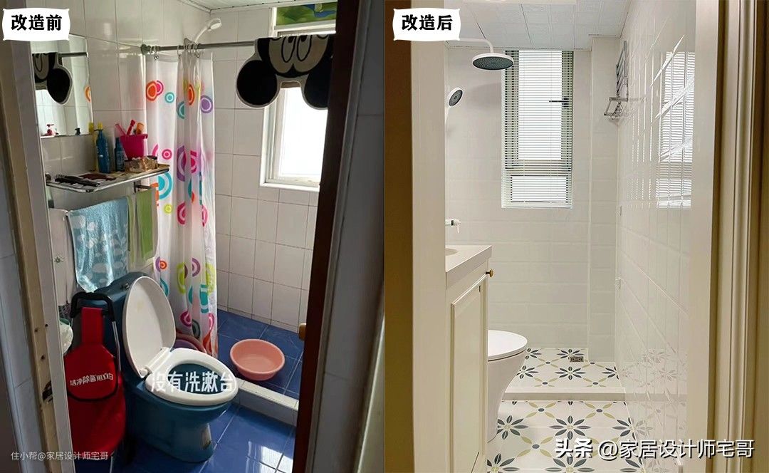 改造后的卫生间,面积虽然没有扩大,但是增设了浴室柜,并且整体的配色给人一种明亮通透的感觉。
