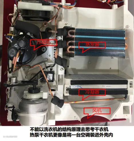 除了直排式(类似衣架式干衣机),目前市面上较流行的烘干方式主要有冷凝式和热泵式两种。其中,冷凝式烘干机技术比较简单,一般在洗烘一体机上使用;热泵式烘干通常搭载在独立干衣机上,简单来说,它的内部结构上更像一台独立的空调。