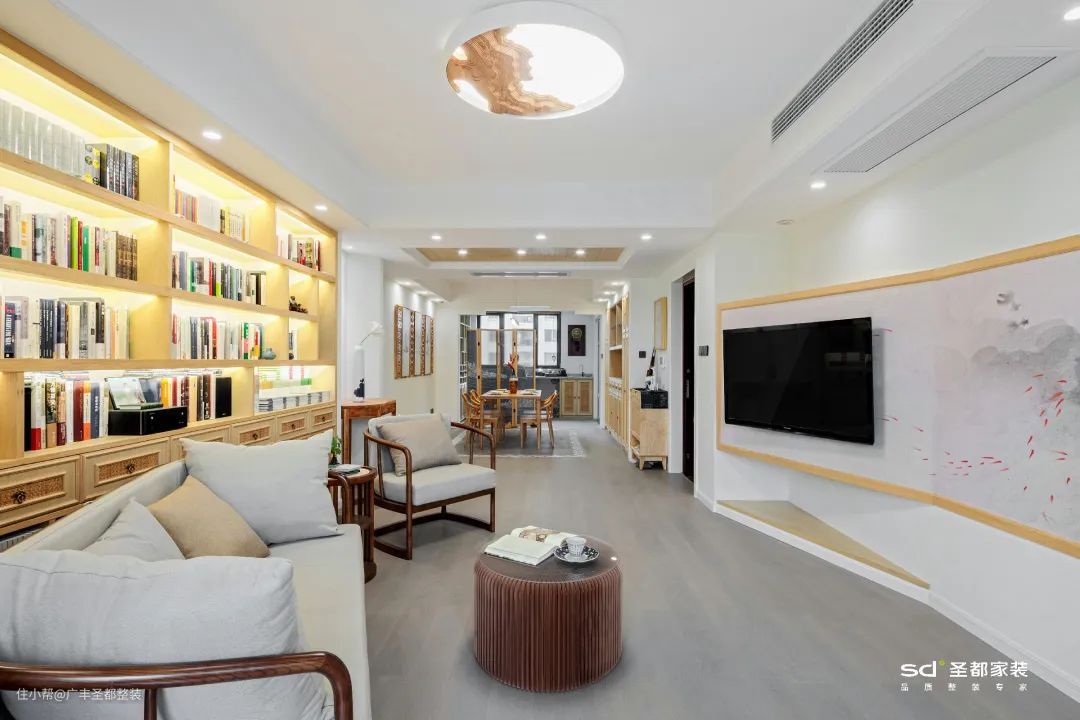客厅想要增加书房的功能,只需设计一整面书墙即可,既能收纳一室书香,又能方便随时阅读,营造浓郁的学习氛围,特别适合有娃家庭。