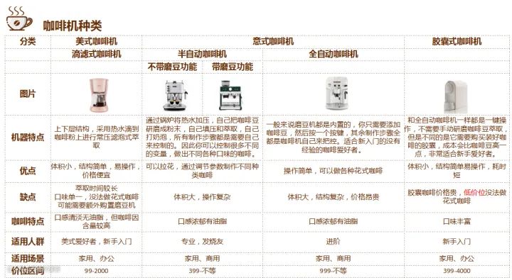 老规矩,在说选购之前,我得先来简单聊一下咖啡机的分类。