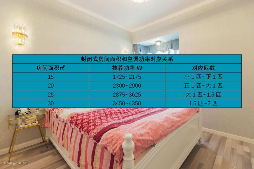 比如20平米的卧室,所需制冷量就是2300W~2900W,对应的匹数是正1匹或大1匹。