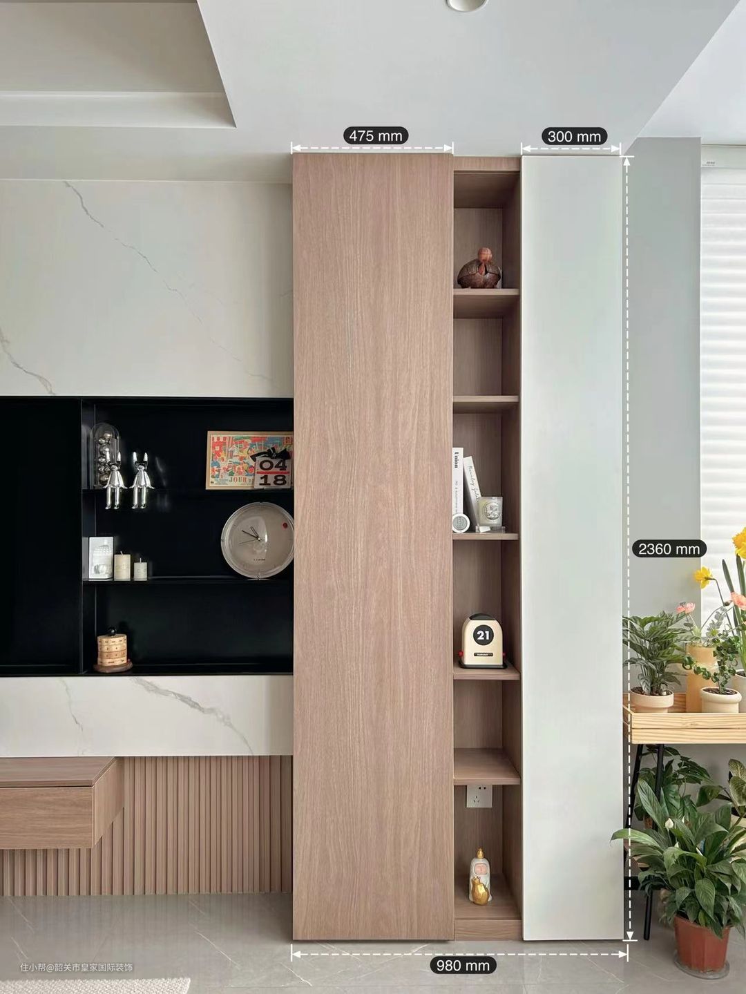 以我家为例子,65寸,嵌入之后,上下各留2cm,左右做了延伸,右侧做了开放格,可以放点装饰物,内嵌12cm,电视挂装好之后刚好齐平。