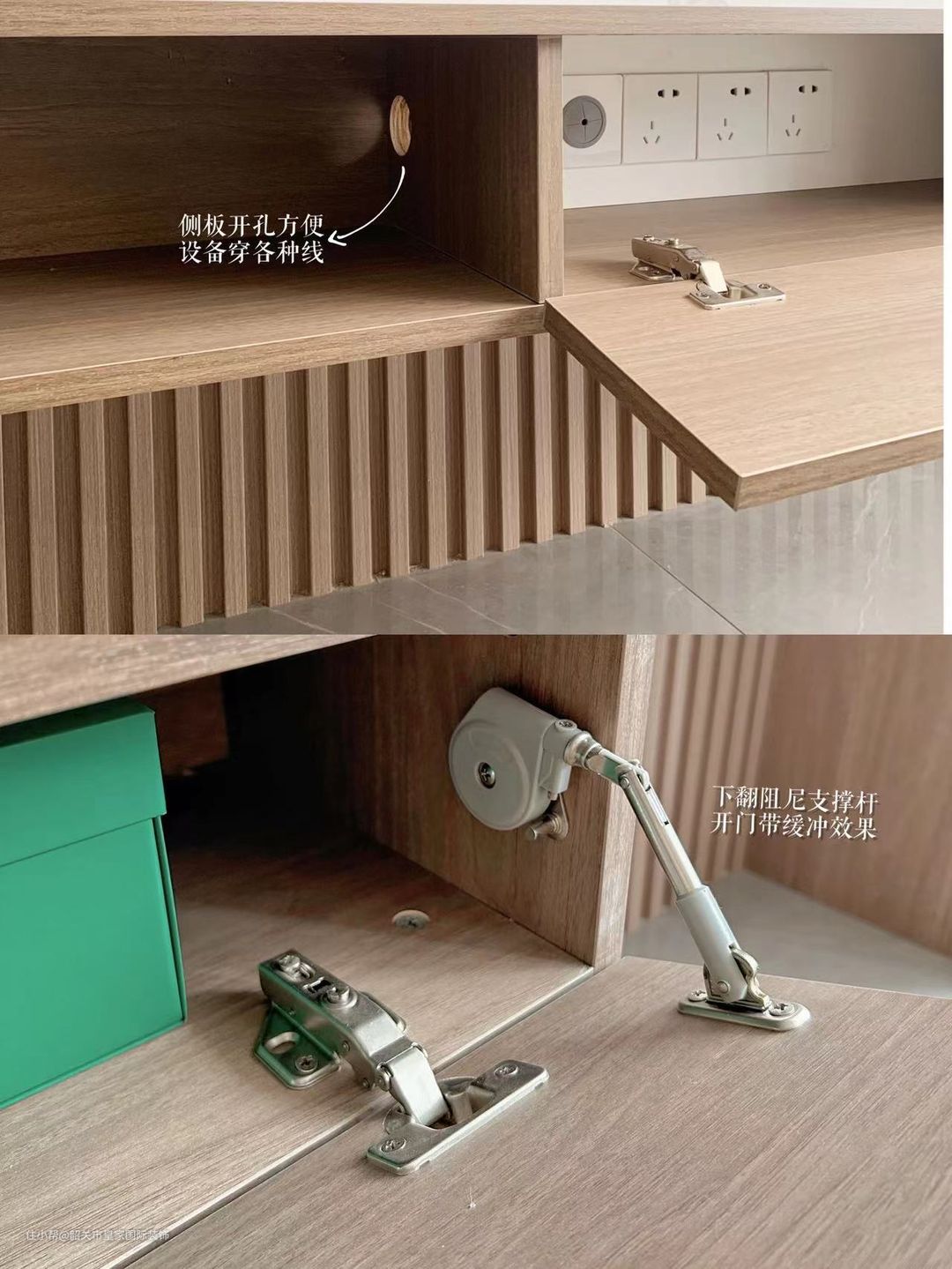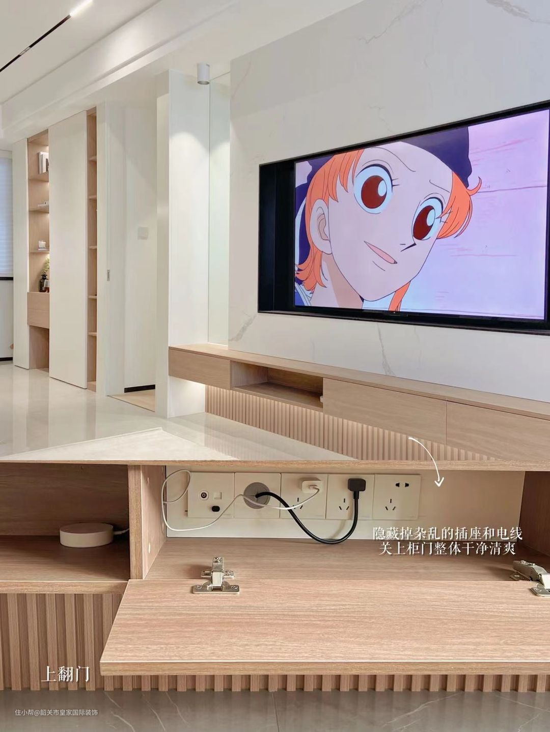 第三格隐藏了电源插座,装修做水电阶段时,电视后方的墙里预埋了PVC50管,电视的电源线就可通过管子插到这的插座上,门一关,所有杂乱的线,插座全都隐藏了。