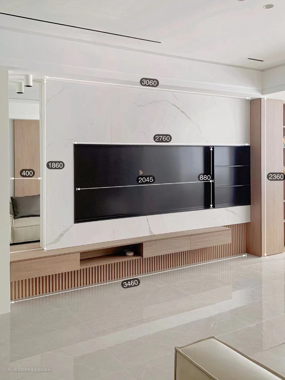 客厅开间3.5米,做收纳柜式的电视背景怕压抑,所以选择以岩板为主体的背景墙造型。