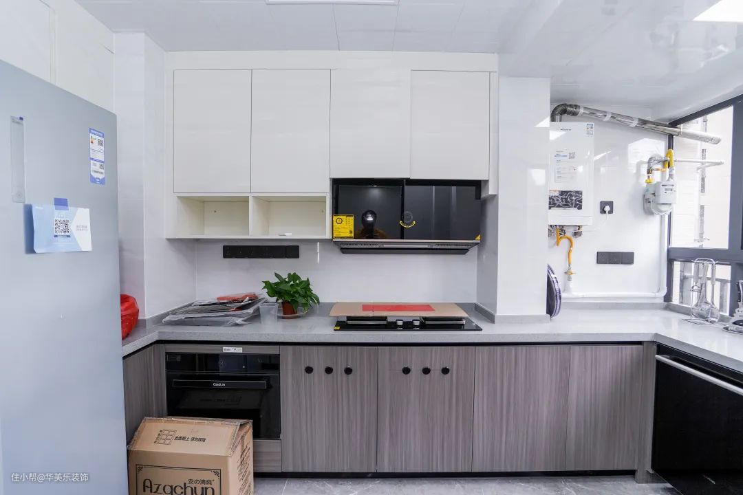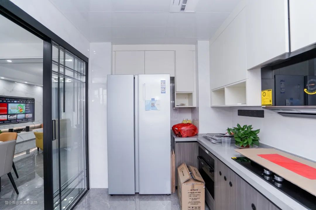 厨房的采光比较好,白色吊柜+木色地柜,还有嵌入式冰箱和推拉门,打造了一个简约舒适、实用的空间。