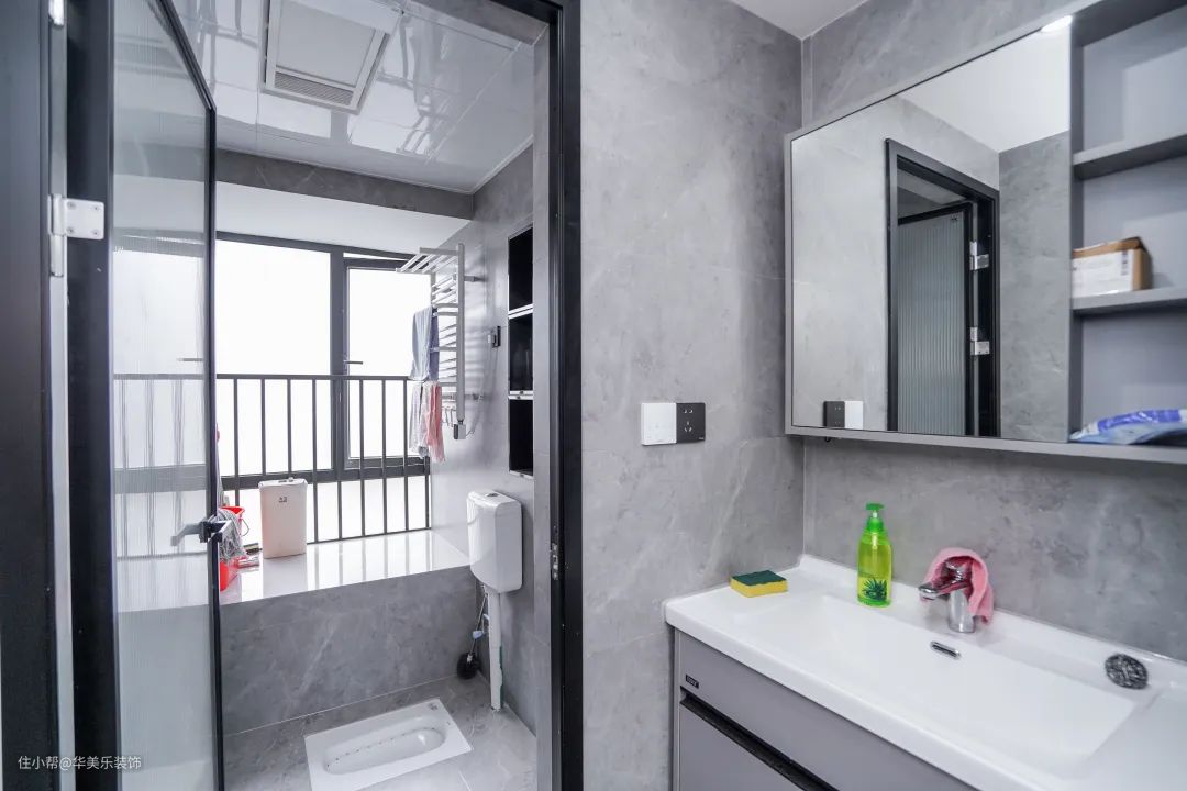 卫生间是一个以灰色为主的空间,大方又好看。用墙做了干湿分离。因为有个飘窗,光源比较充足,所以选用简约、光线柔和的吸顶灯。