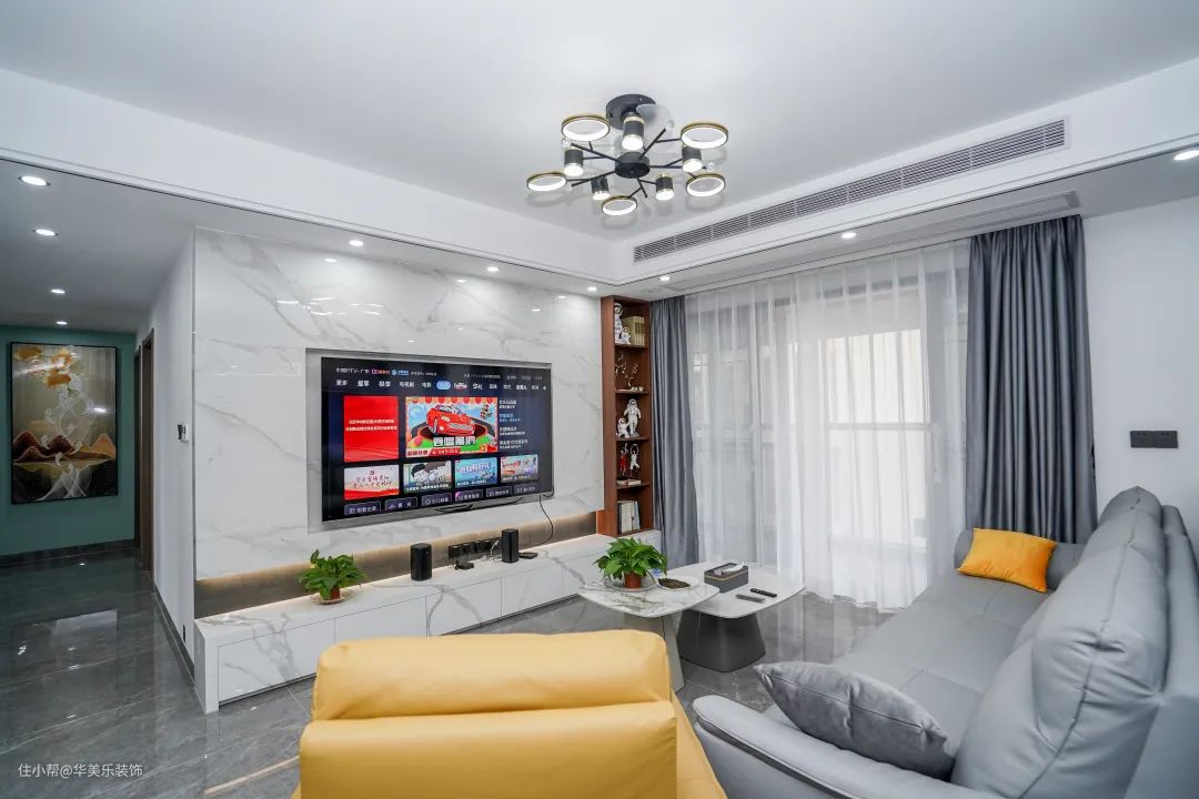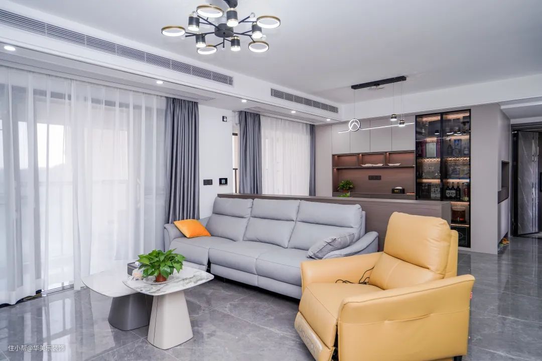 客厅是一个比较现代简约的空间,以工业灰为主,黄色点缀,配色淡雅清爽。吊灯+筒灯照明,非常高级整洁的搭配,会让整个空间更干净、时尚。
