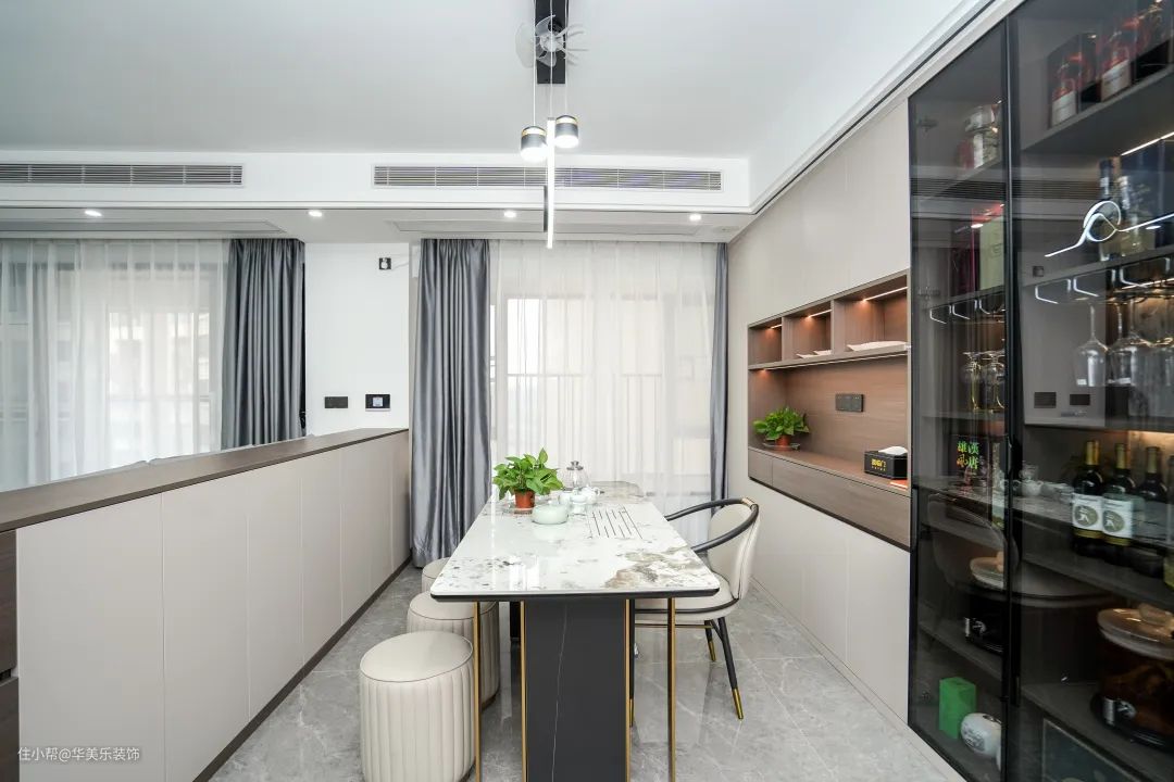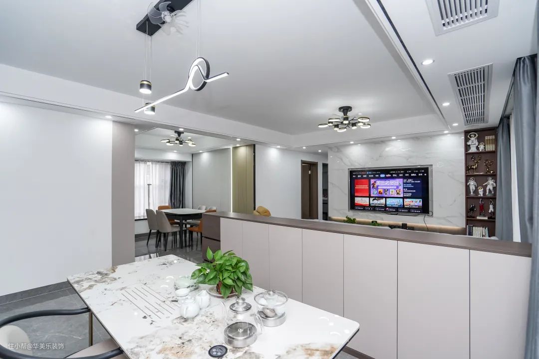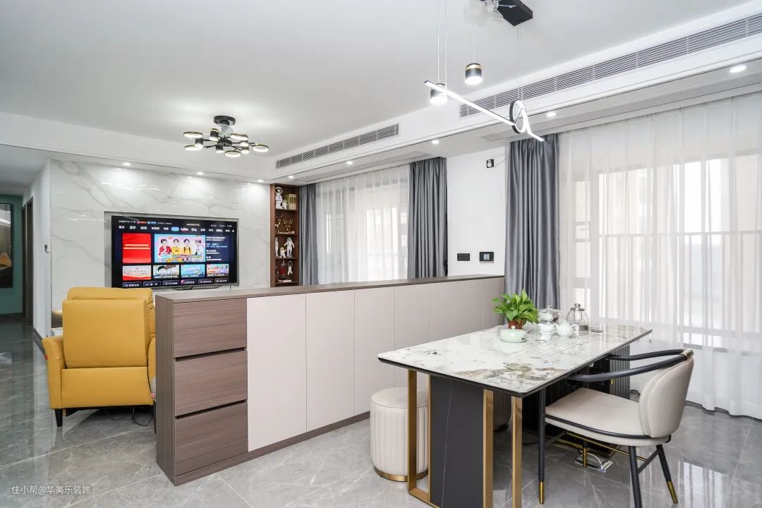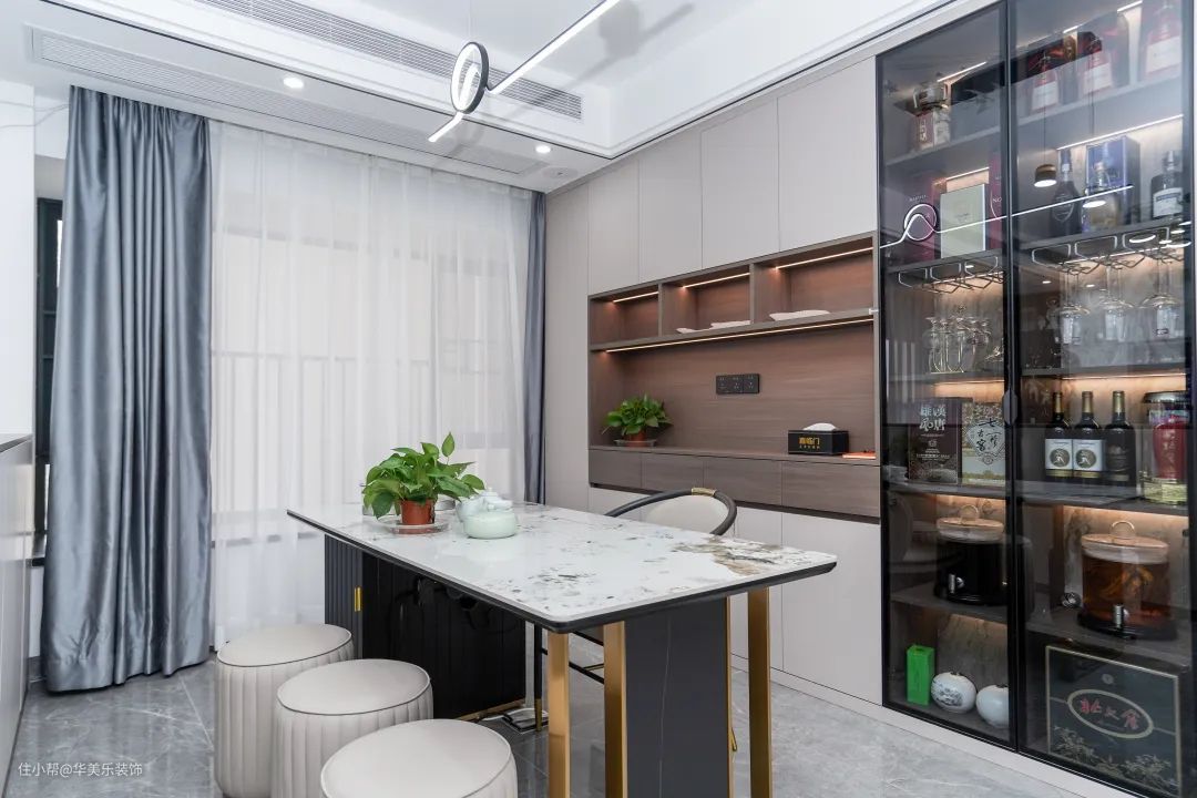 3、业主平时客人比较多,尤其重视客厅的设计,既要美观又要兼顾实用性。我们用长3.3m储物柜做了隔断,打造了一个茶室,还做了定制酒柜,增加收纳的同时还提升了房子逼格,整个空间更美观整洁。