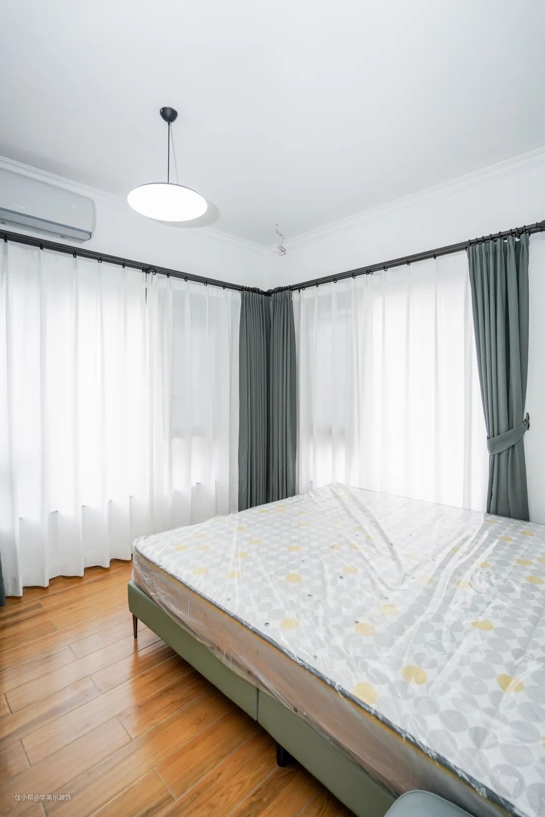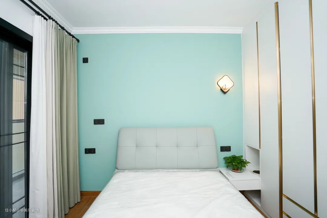 女儿房配色比较清爽,运用了同一色系但不同饱和度的颜色进行搭配,比如薄荷绿乳胶漆背景墙、橄榄绿窗帘,柔和又治愈,这样搭一般都不会出错。再配上独特的床头灯和简约吸顶灯,整体看起来清爽又舒适。