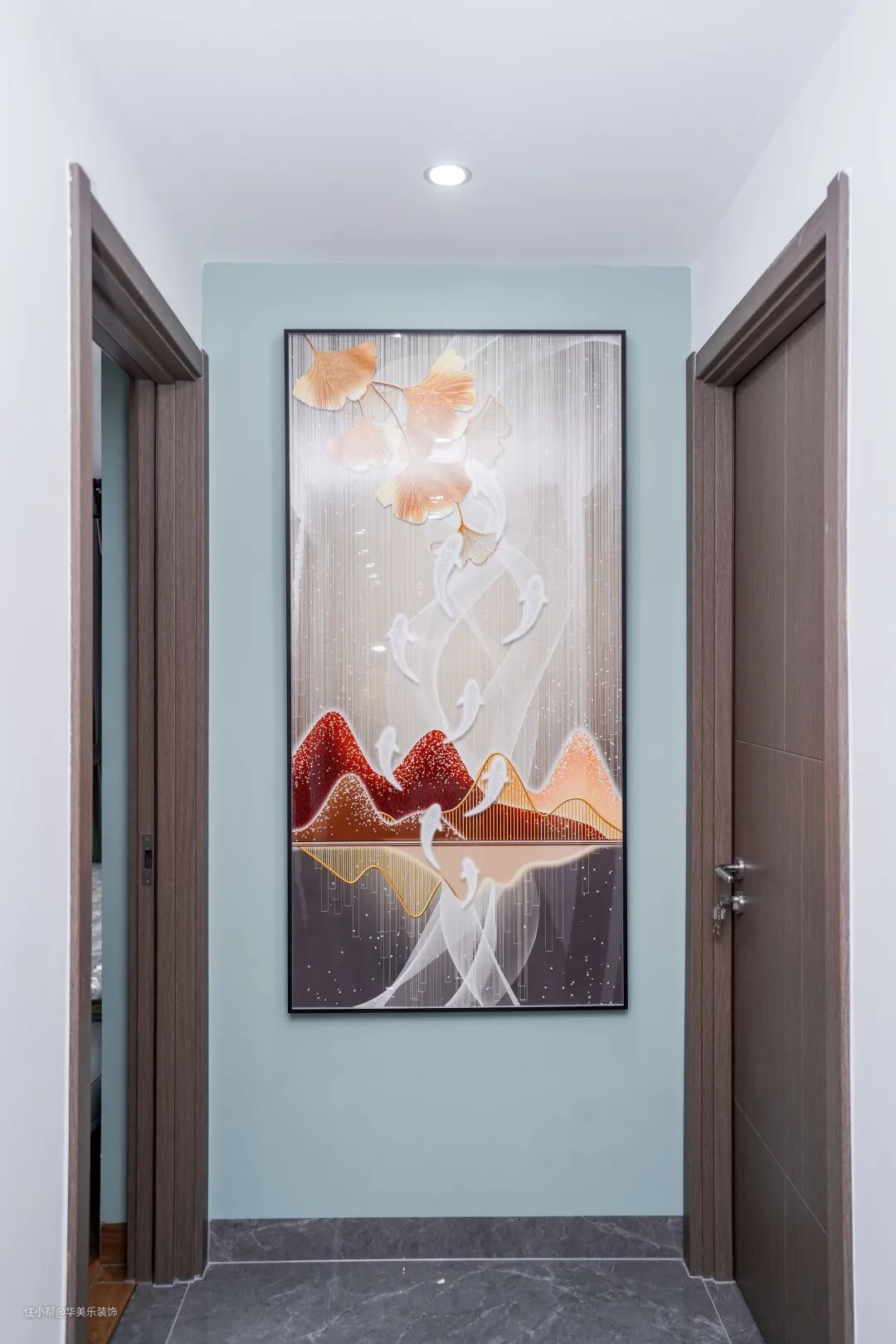 过道非常有特色,绿色乳胶漆背景墙,搭配挂画,比单调的大白墙更好看,更有品位。
