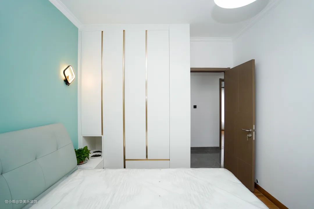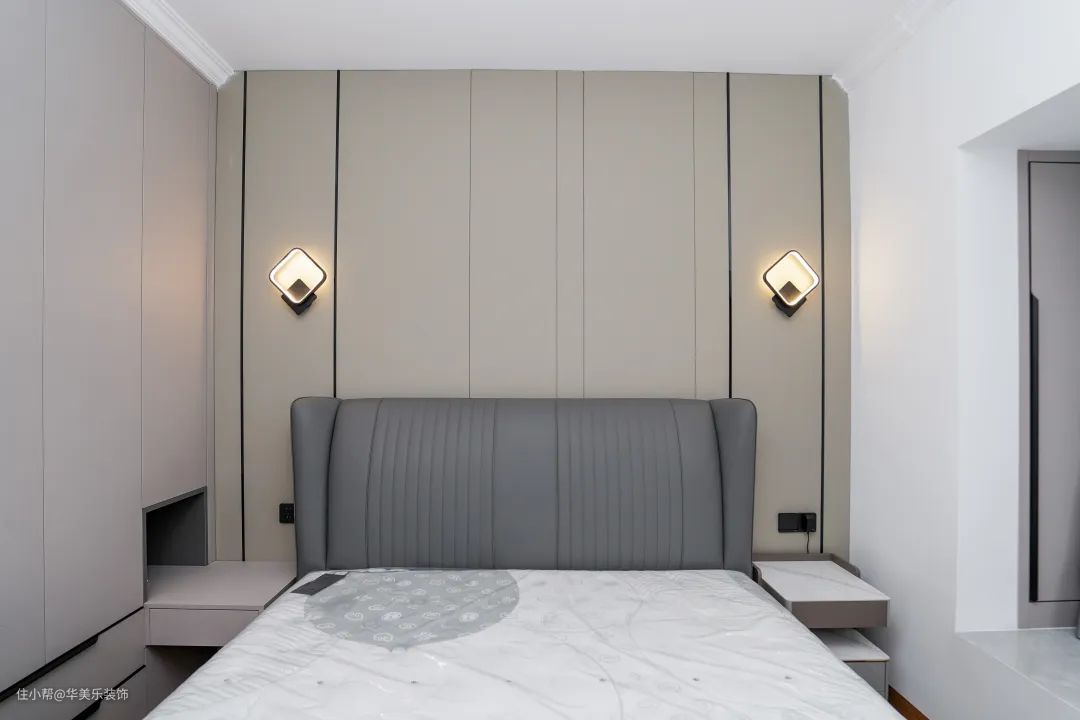 两边方型床头灯照明,柔和又温馨。嵌入式定制衣柜,充分利用了空间,也非常好看。