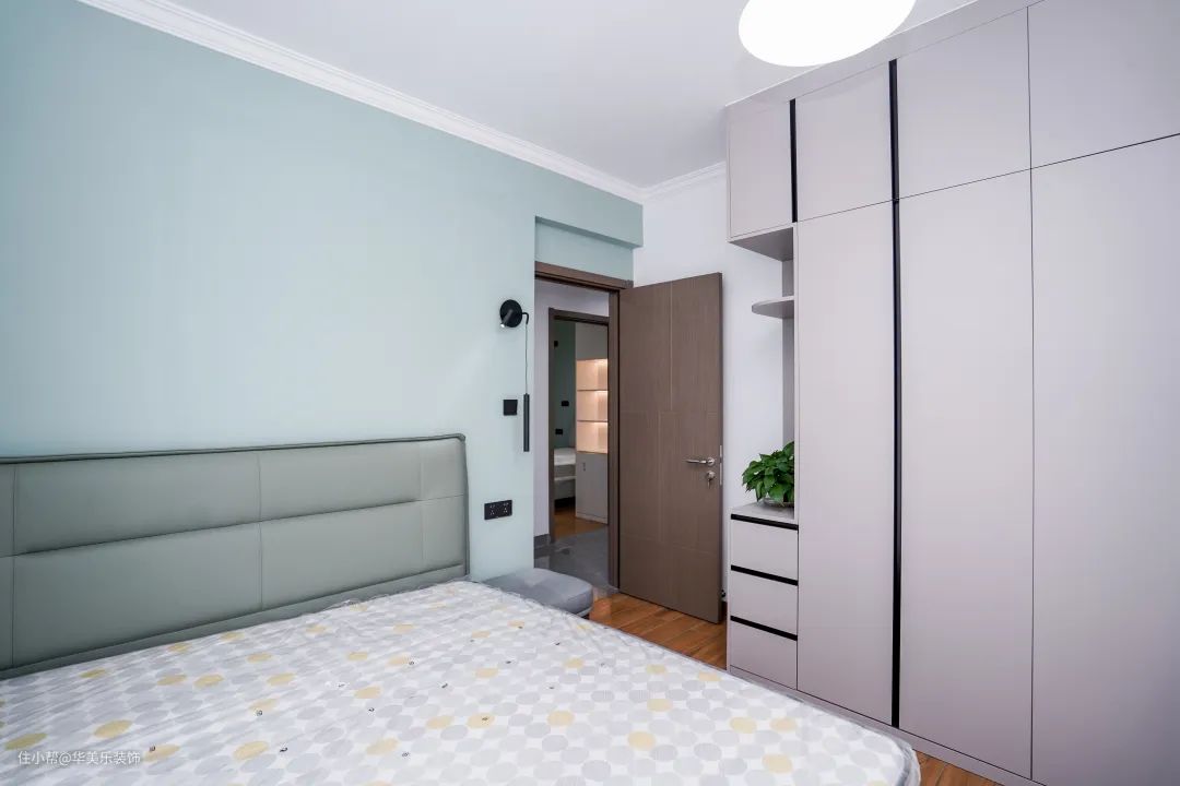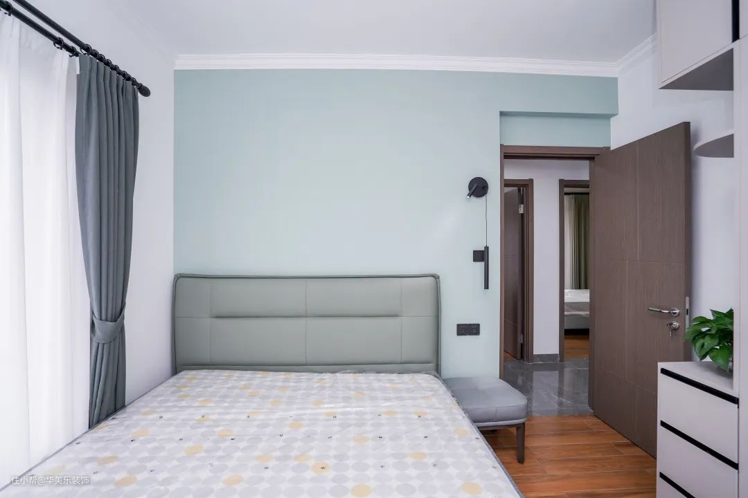 床头背景墙涂了粉蓝色乳胶漆,非常适合用在卧室,柔和又大气。选用了木质地板,没有地板的冰凉感,比较舒适,但这种颜色不是很好驾驭,建议大家在选择时要谨慎一些。