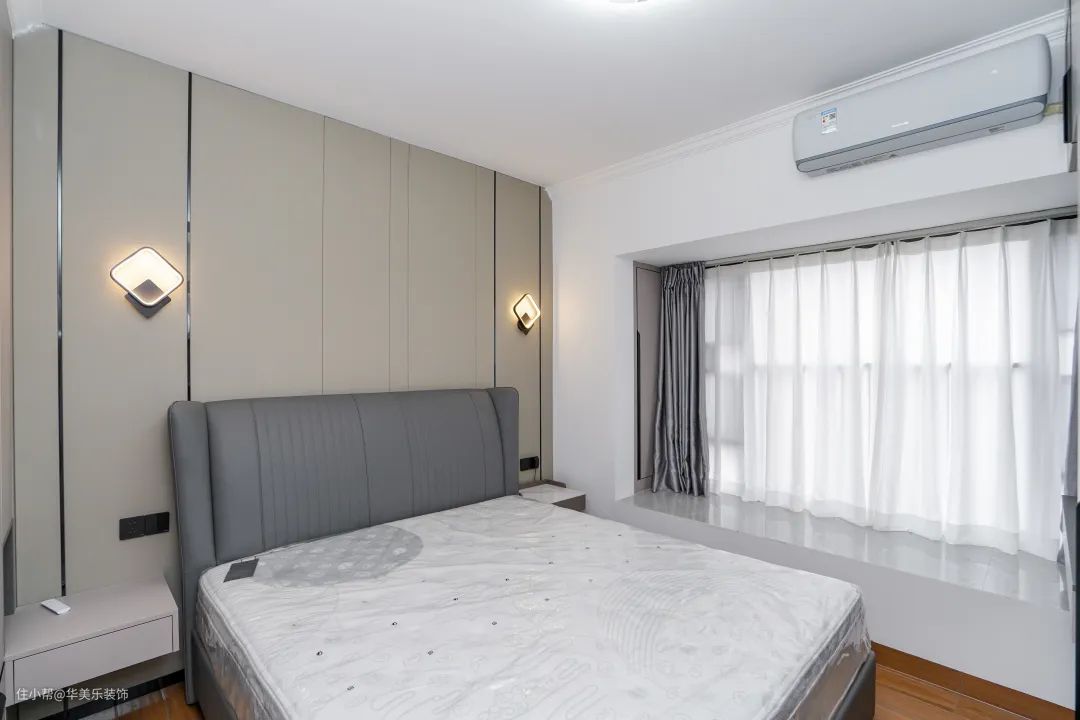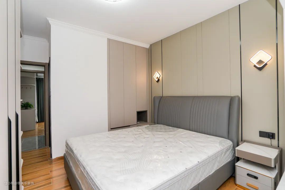 主卧背景墙用木饰面打造,低饱和度的颜色,视觉舒适,还显温馨、质感,居住性极佳。
