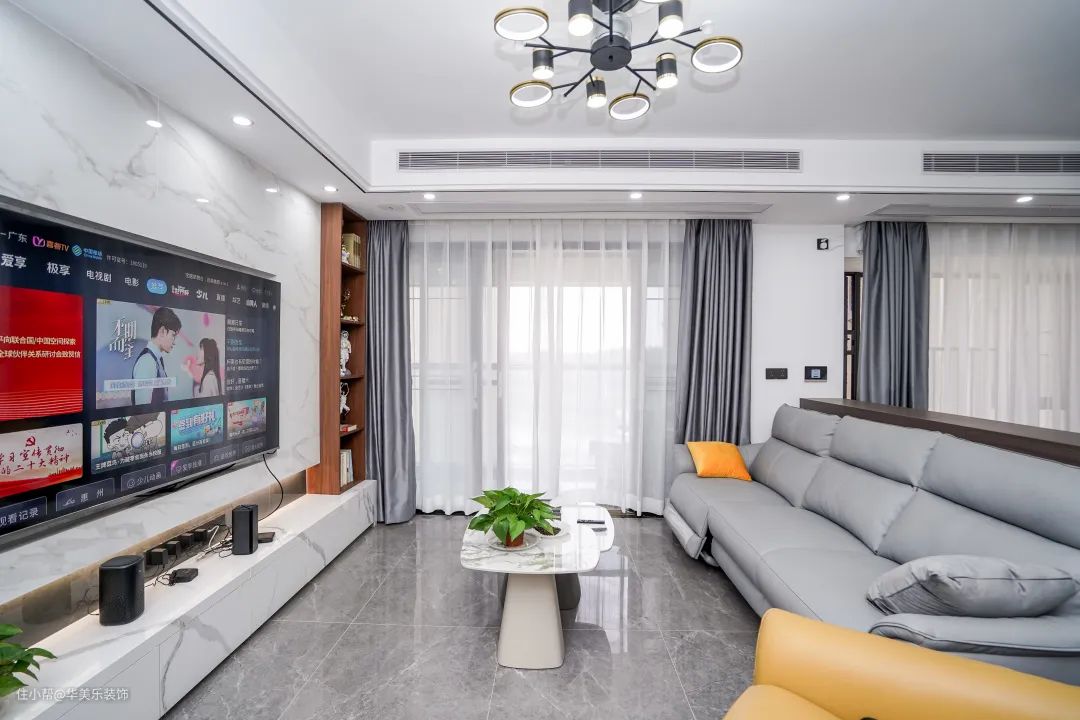 大理石+木格栅电视背景墙,客厅的门面担当。这两种材质组合在一起,高级精致又有档次,大理石纹路好看舒适,能很好地提升客厅的质感和格调。纱质窗帘,飘逸又遮光。