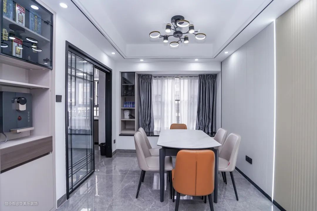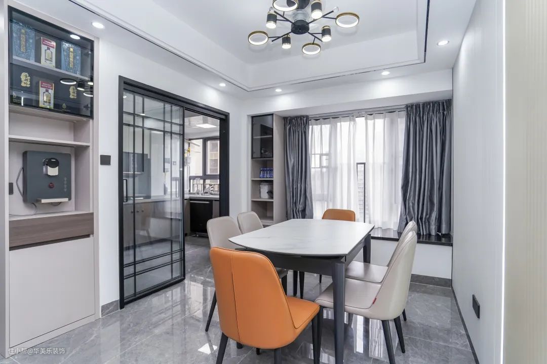 餐厅右边是木饰面背景墙,左边是厨房、餐边柜,显得整个空间非常有质感。厨房使用了黑色推拉门,方便又好用。天花板选用跟客厅一样筒灯+吊灯的照明方式,简约又好看。