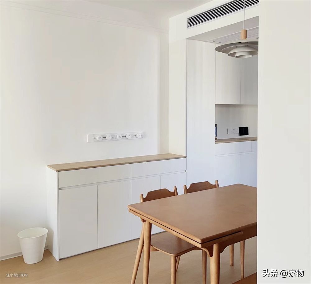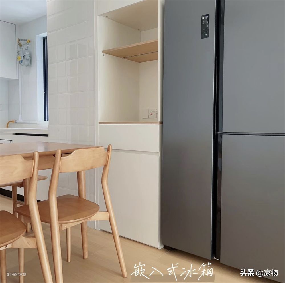 冰箱外移,嵌入到了餐桌旁边的柜子里,尺寸刚好合适,能够在填补冗余空间的同时,将墙面找平,同时,吃饭时拿取饮品、做饭时取出食材都很方便。