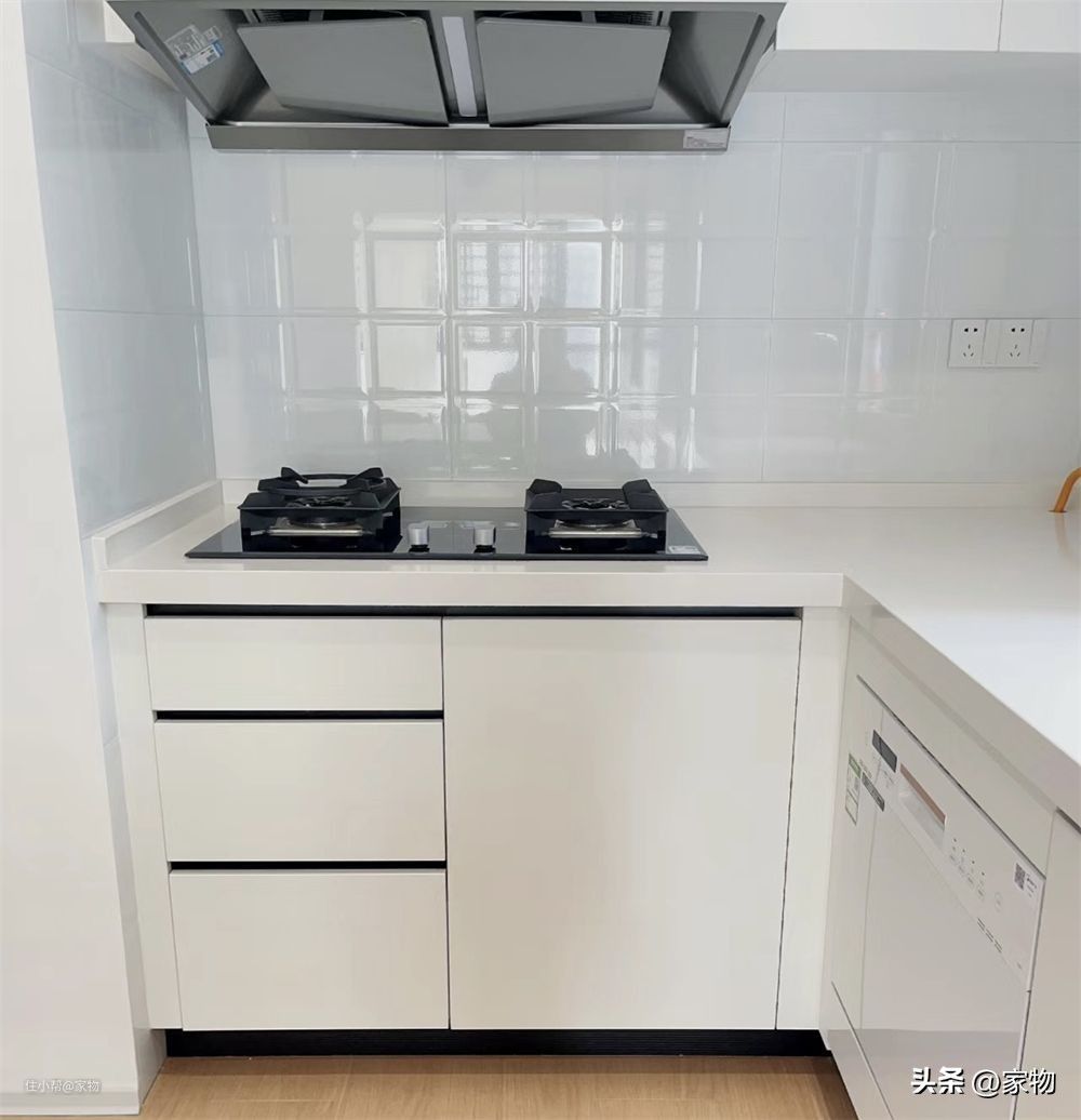 厨房的烹饪区,也尽可能采用了嵌入式的布局,除了我们刚才说到的洗碗机,就连灶台也嵌入橱柜台面,再加上底部一水的白色柜面,看起来真的是干干净净。