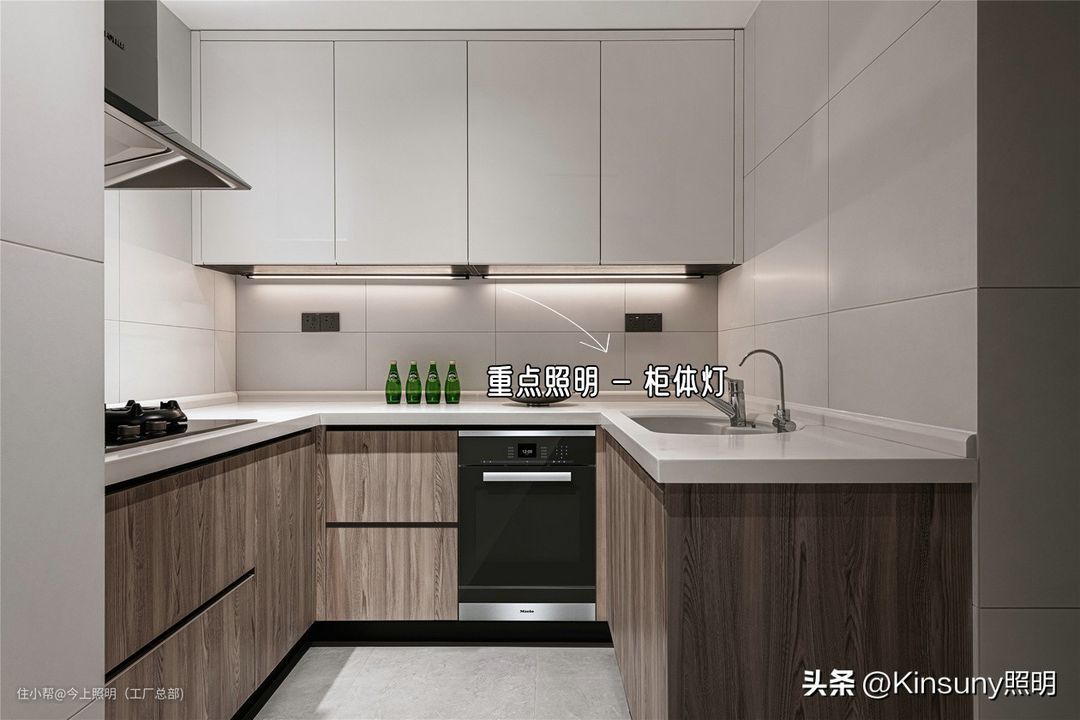 要确保每个操作区都有充足的灯光,所以我们不能只在厨房天花的中央安装一盏主灯,还可以在柜体下方安装灯带或洗水槽、切菜区、烹饪区等操作台上方安装射灯,提供重点照明。