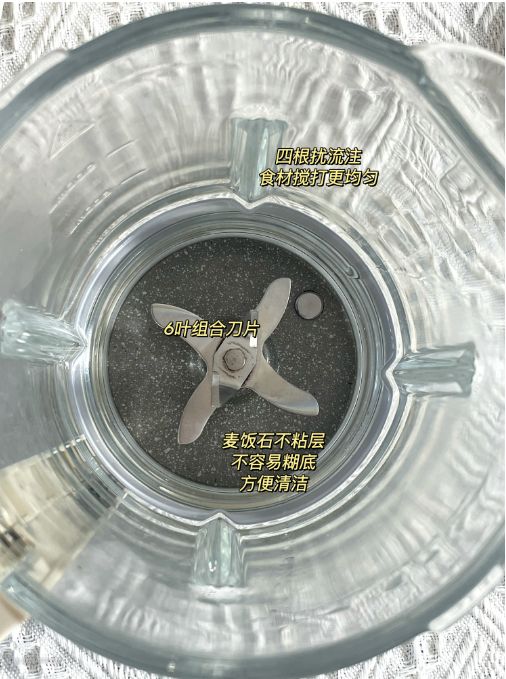 刀片使用的是2层6叶组合刀片,能够360度循环瞬间切割食物。另外还有四条扰流柱的设计,能够让食物在搅拌的过程中更加均匀的被切割。以我最近常喝的双黑米糊为例,我自己在喝的过程中感觉是十分细腻的,完全喝不出渣渣的感觉。