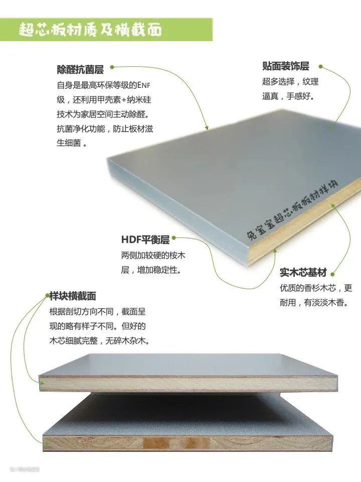@只爱陌生人stranger:在制作工艺方面,与多层板、颗粒板不同的是,超芯板是直接用生长周期长的香杉木做成实木芯基材,在此基础上再加上HDF平衡层、贴面装饰层和除醛抗菌层,因此超芯板更环保、承重性更好,防潮防虫特性也更好。