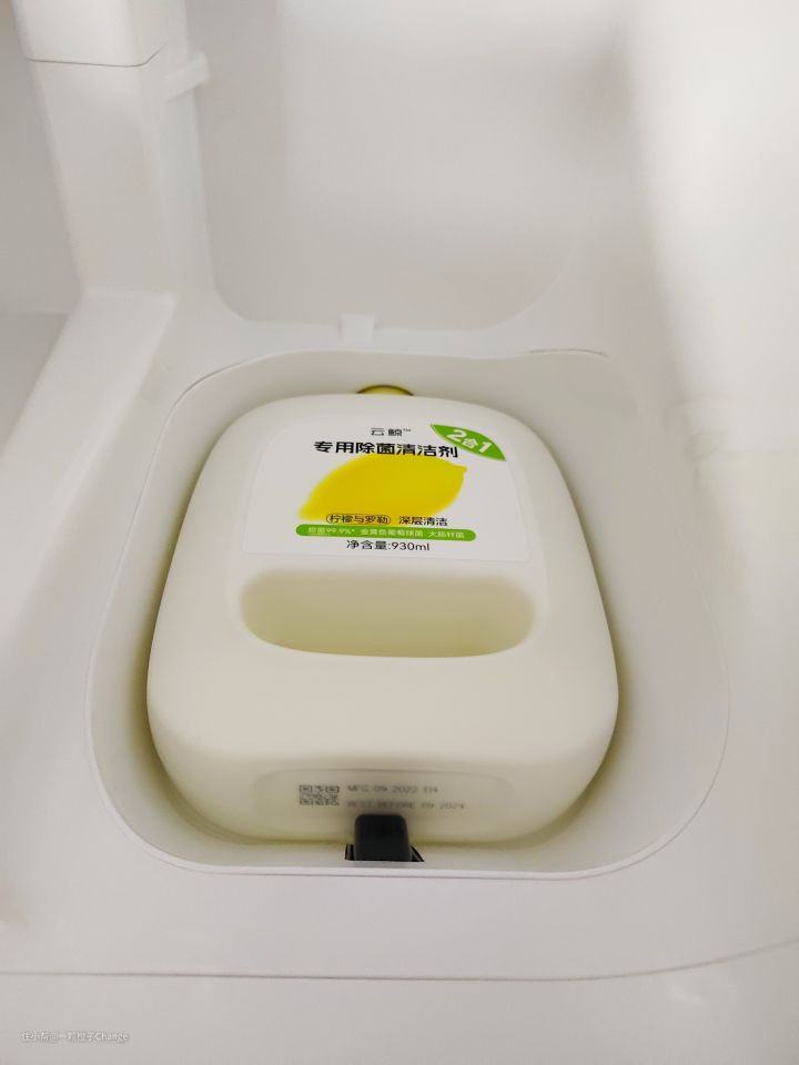 产品里面带了一瓶930毫升的清洁剂,然后用户只需要把它插入到水箱前面的基站留出的空间,然后就可以实现自动添加清洁剂,搭配自动上下水算是非常智能化和自动化了,正常的消耗情况下,支持洗拖布>550次,大约可用2-3个月,真正实现了用户的省心省力。
