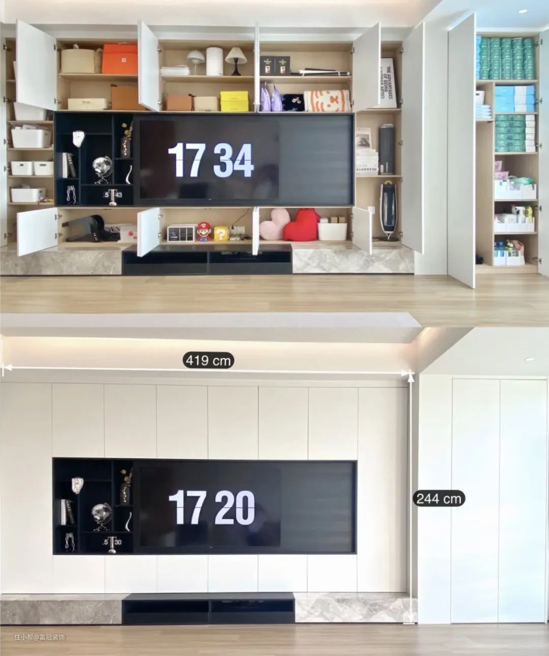 我真的想展示我喜欢的东西。柜门由玻璃和亚克力材料制成,以隔绝灰尘,防止橱柜过于凹陷。