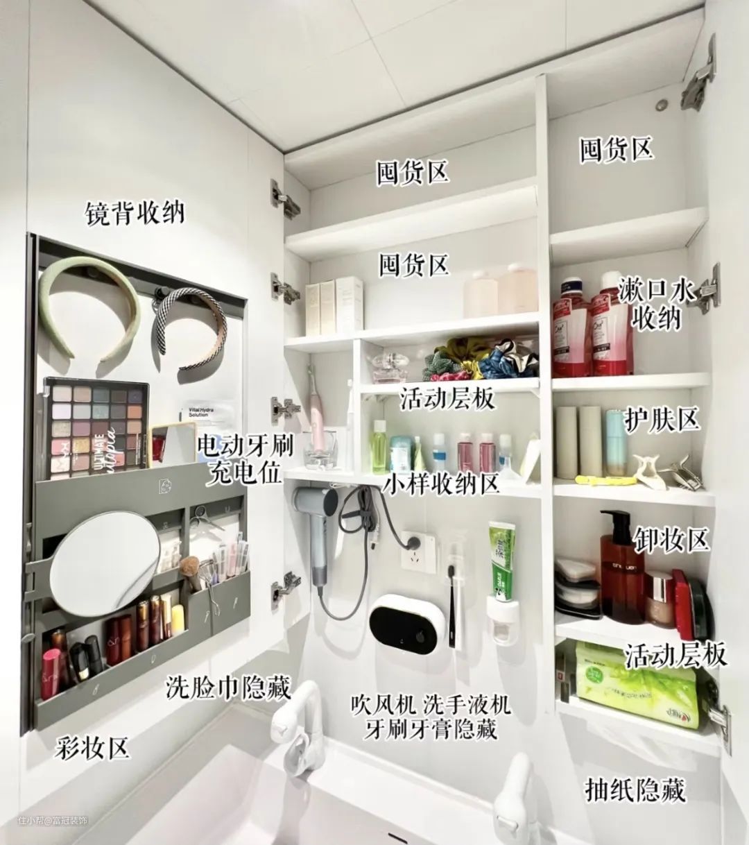 例如,内置充电端口可用于为牙刷充电。你不需要把它从浴室里拿出来充电;有一个地方你可以画洗脸巾,所以你可以少买很多收纳配件。
