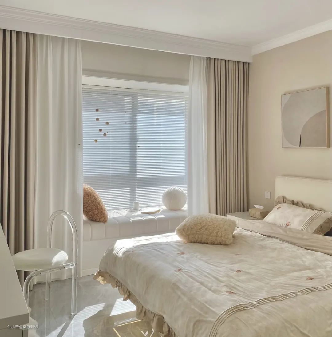 在没有足够的配色技巧的情况下,我们敦促您放弃配色窗帘,直接选择纯色,如奶茶色、浅灰色和大地色,搭配一层白色的窗纱,经久耐用。