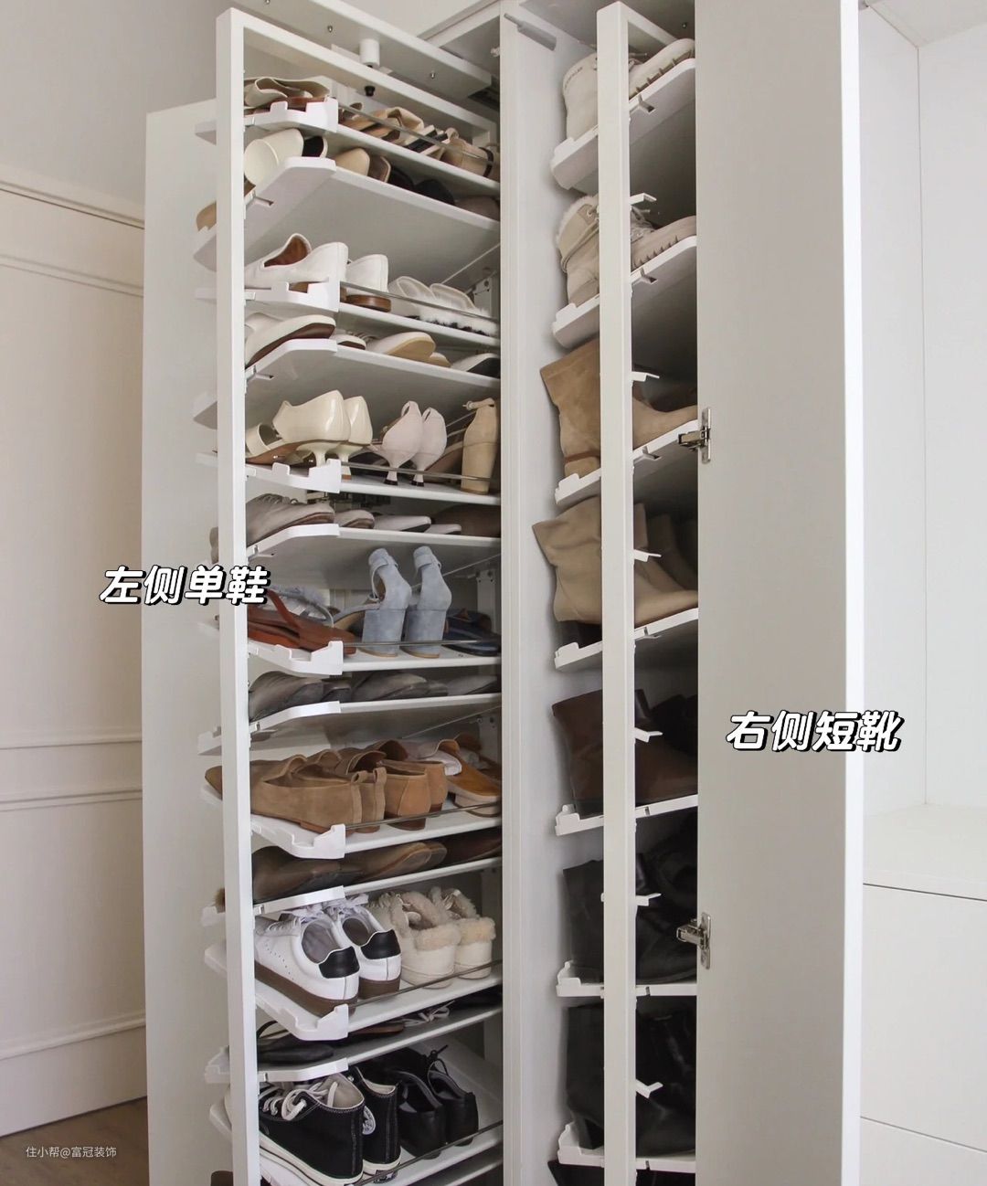没有走廊的房子可以考虑插入斜顶鞋柜(厚度<30cm),这对超大和高顶鞋不友好。