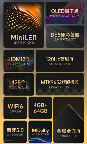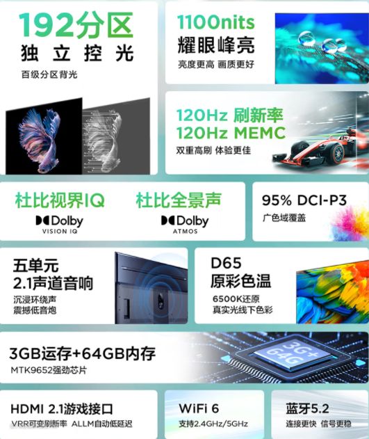 R645C是主打性价比的雷鸟旗下的高端型号,整体的配置十分不错。方面囊括了目前主流的55、65、75三个尺寸。作为一款Mini led电视,R645C拥有128/160/240个控光分区,控光表现优异。峰值亮度达到了1100nit,可以实现优秀的HDR效果。屏幕支持4K 120Hz刷新率,支持96%的P3广色域。硬件方面采用A73四核芯片+4G运存,运行流畅反应迅速。同时支持WIFI,支持全场景语音控制。支持HDMI 2.1接口,对主机游戏用户较为友好。雷鸟之前几款产品凭借性价比获得了不少的口碑,硬件堆料给力,软件和调教的弱项也在逐步优化,整体来说R645C比较适合追求高画质同时想兼顾性价比的小伙伴。