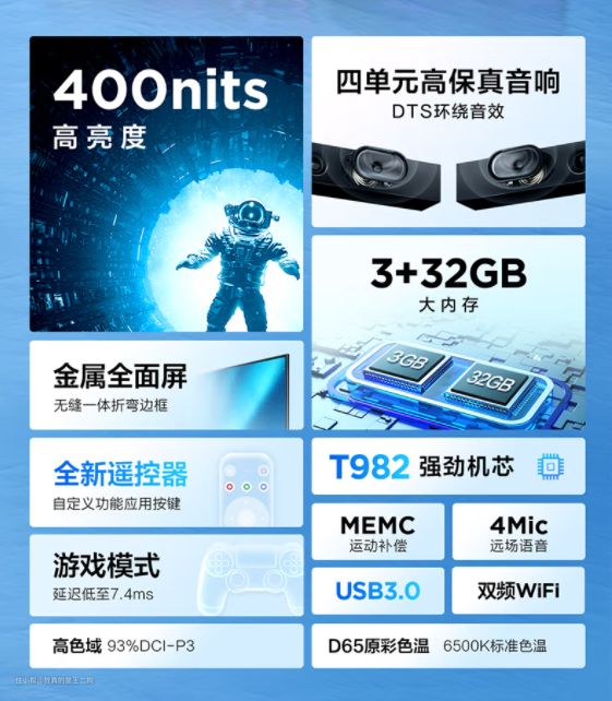 雷鸟热门型号,对标小米ES 2022版的产品。整体硬件堆料出色,55寸直接被打到3K内性价比颇高,很适合追求画质同时需要控制预算的小伙伴。峰值亮度达到了800nit,标准中端电视的亮度水准。四核A73芯片+3G运存、80/90/120个分区背光、93% DCI-P3广色域、带MEMC、支持杜比视界和杜比全景声,整体堆料可谓扎实。不过机器不支持HDMI 2.1接口,如果搭配主机游戏的不是特别适合,适合追求画质体验的小伙伴。