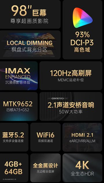 雷鸟推出的98巨屏电视,延续了雷鸟高性价比的特点。硬件堆料方面也比较足,192个背光分区、120Hz高刷屏、MEMC运动补偿、93% P3色域、HDMI2.1接口、2.1声道安桥50W音箱系统、A73四核芯片+4G运存、双频WIFI6。峰值亮度达到了800nit,VRR和ALLM加持下的HDMI 2.1接口,搭配120Hz高数刷,对游戏玩家也十分友好。没有开机广告,自然也是比较舒服的。同价位中,整体配置比红米MAX 98略好,基本和TCL 98T7E配置相当,不足2W的价格性价比不错。