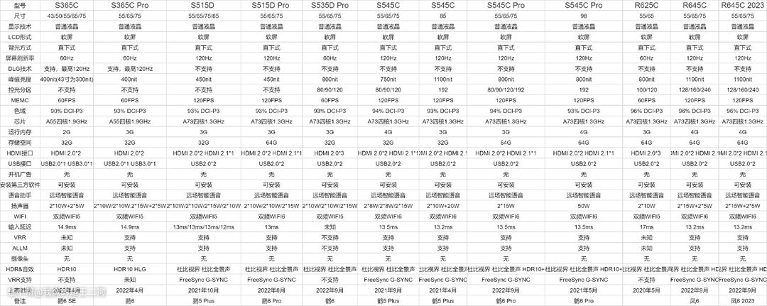 各系列的定位按照越来越高的排序,雷鸟在售的大致型号如上表格。这里顺便吐槽下雷鸟电视的命名规则,可以说比较乱。一开始是数字+字母+型号补充,后面改成动物+数字+型号补充,然后现在R645C又在产品后缀加2023款。希望厂家能学习下索尼、海信等品牌的命名规则,用户识别也更方便。