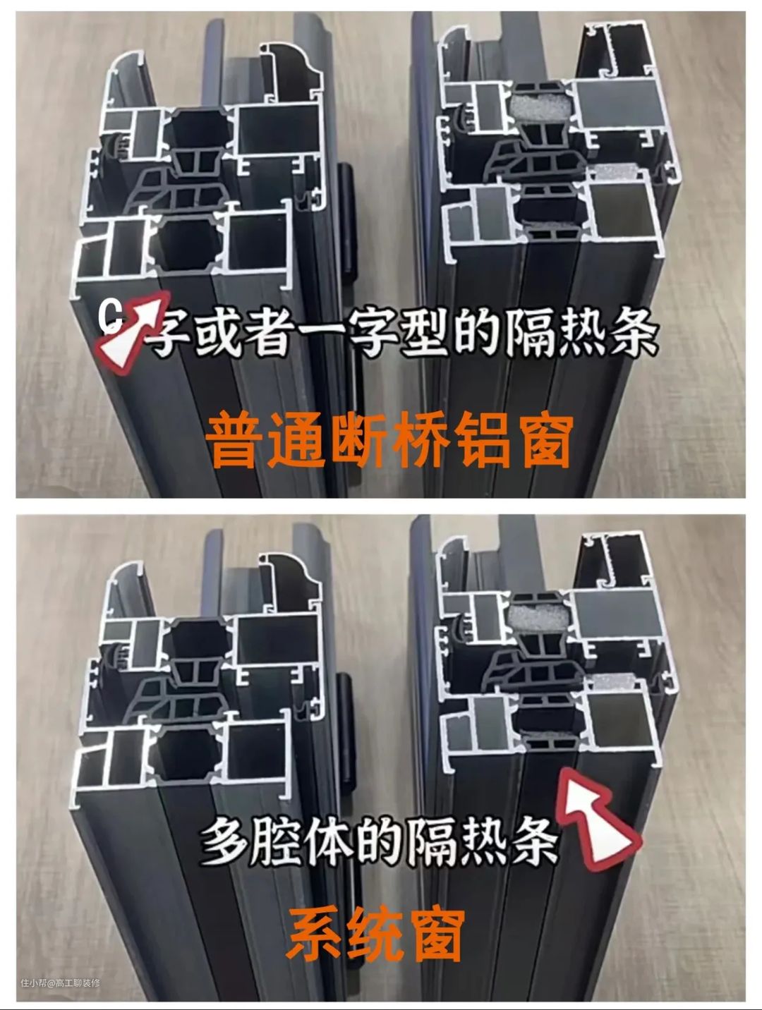 两种不同材质的窗户,在安装上使用的密封方式也不一样,系统窗是安装上玻璃后,在玻璃框上摁上一道密封胶条,而普通的断桥铝窗户是用的中性硅酮耐候胶,所以密封方式上就不一样