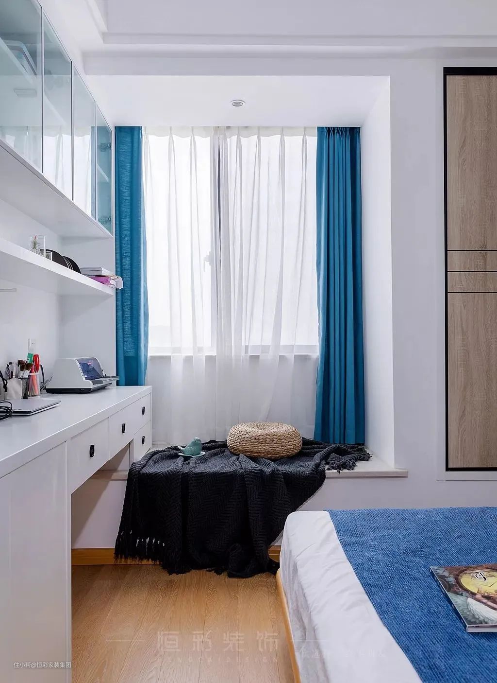 或者也可以直接借助飘窗的部分面积打造书桌柜,剩余面积可为读书和休闲区域。